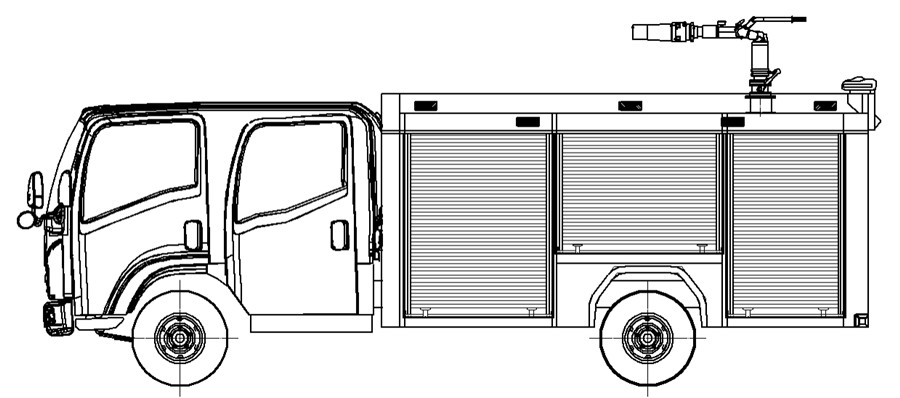 整車由消防員乘員室和車身兩大部分組成,車身布置采用內(nèi)藏罐式結(jié)構(gòu),左右兩側(cè)為器材箱,中部為水罐,器材箱后部為泵房。