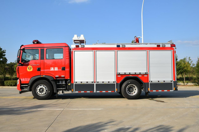 我公司生產(chǎn)的T5G單橋城市主戰(zhàn)消防車采用中國(guó)重汽集團(tuán)濟(jì)南卡車股份有限公司生產(chǎn)的ZZ5207TXFV471GF5型二類汽車底盤(pán), 該車原裝雙排駕駛室,可載含駕駛員在內(nèi)的乘員6人,駕乘舒適輕便。該車采用DC-CAFS60/45M型集成壓縮空氣泡沫滅火系統(tǒng),該壓縮空氣泡沫系統(tǒng)操控簡(jiǎn)易,泡沫生成實(shí)現(xiàn)即時(shí)全自動(dòng)微機(jī)精確調(diào)控,并設(shè)多重保護(hù)與報(bào)警系統(tǒng),消防作戰(zhàn)員可依據(jù)復(fù)雜的火場(chǎng)情況,方便地借助按鈕選擇干泡沫、濕泡沫等不同類型的泡沫滅火方式。該套系統(tǒng)不僅裝有A類泡沫原液,還裝有B類泡沫原液,可高效率地?fù)錅绾涂刂艫、B類物質(zhì)火災(zāi),并具備良好的環(huán)保性能。另外該車配置有牽引電動(dòng)絞盤(pán),7.6米氣動(dòng)升降舉升4*1000w照明燈和10.5kw車載發(fā)電機(jī),使得該車還可獨(dú)立開(kāi)展偵查、破拆、救生、照明、防護(hù)等綜合搶險(xiǎn)救援功能。